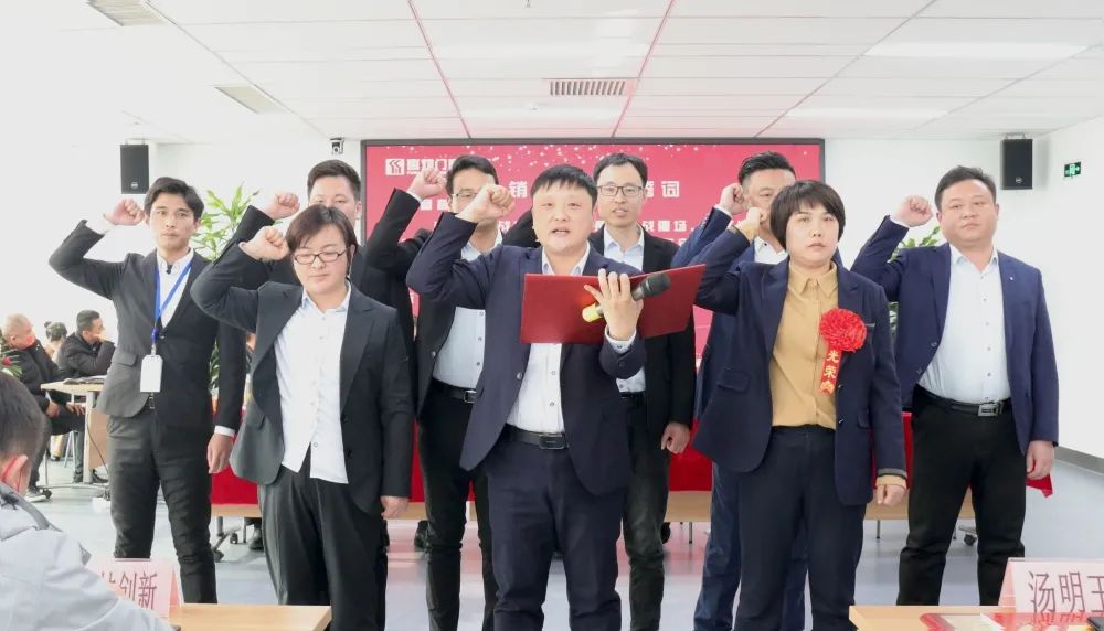 在热烈的掌声中,富煌门窗幕墙公司副总经理吴克云带领门窗幕墙销售团队做庄重的宣誓仪式。