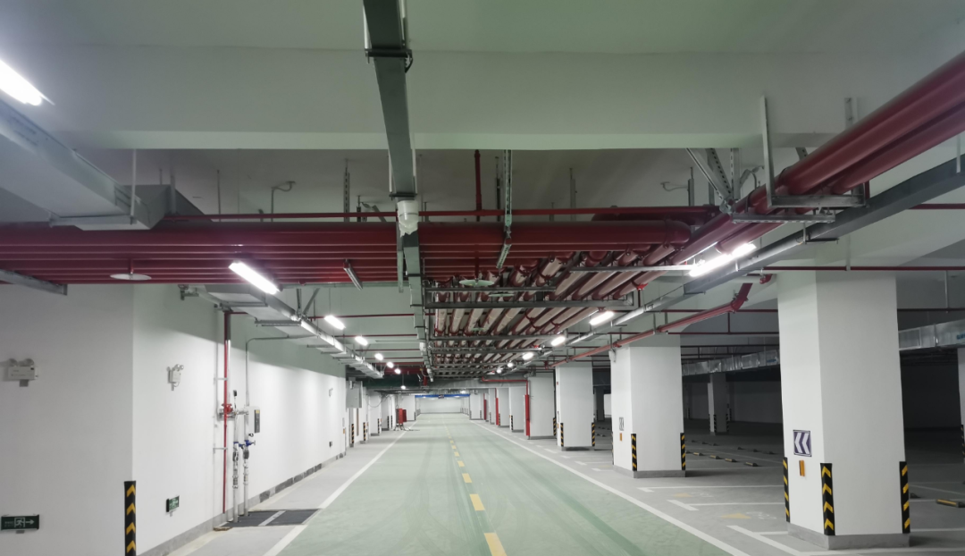项目连接天门湖公租房的景观轴线采用架空空间,使用无柱大空间--30Mx28M大空间,充分体现了钢结构的优势,斜支撑展示了钢结构的结构之美。此区域空间底板和顶板采用桁架钢筋楼承板,免支模底板也为装配化施工提供了便利条件。