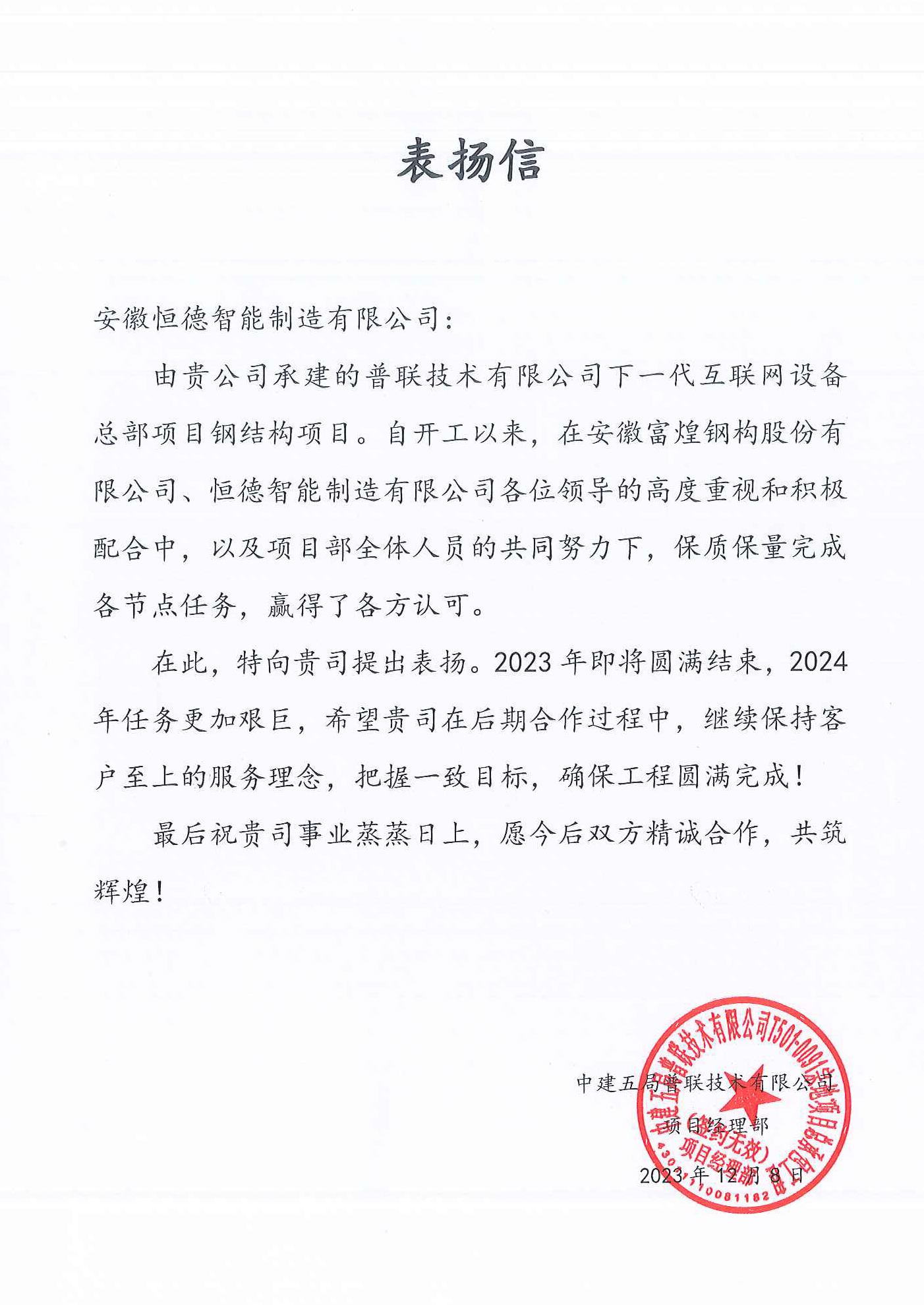 普联技术有限公司项目经理部给恒德公司送来表扬信