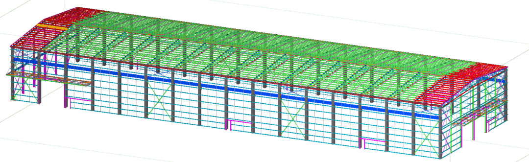 该项目为桁架式轻钢屋面厂房结构,总长104米,宽33.2米,檐口高度12米,主体采用平面矩形管桁架结构,并在桁架上下弦设置屋面支撑。项目涵盖钢屋架、檩条、抗风柱、吊车梁及雨棚等部分的设计与加工制作,总用钢量约170吨。项目设计充分考虑当地使用需求,纵向布置两台10吨吊车,西侧山墙面另设5吨吊车,结构整体坐落于已完工的混凝土柱上,兼顾实用性与安全性。
