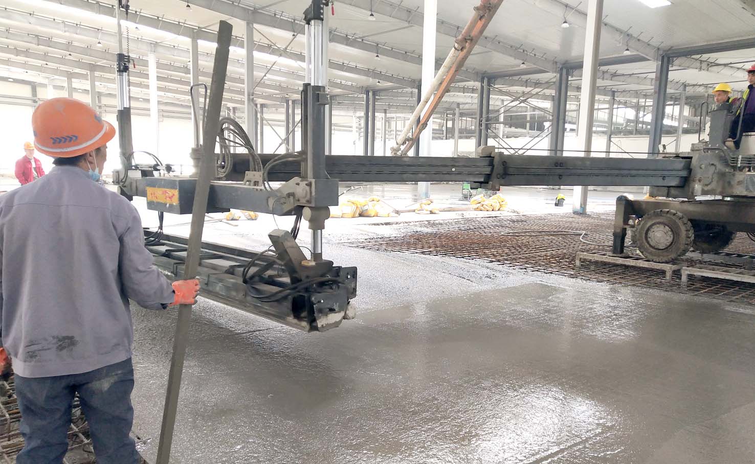 3、地坪内部整平,采用大型激光整平机整平。整平机行驶路线上,用镀锌方管焊接专用马道,确保整平机形式过程中不会对地坪钢筋造成扰动,且针对局部机械整平不到位的地方,采用人工使用2米刮杠找平,以确保地坪整体平整度达到要求;