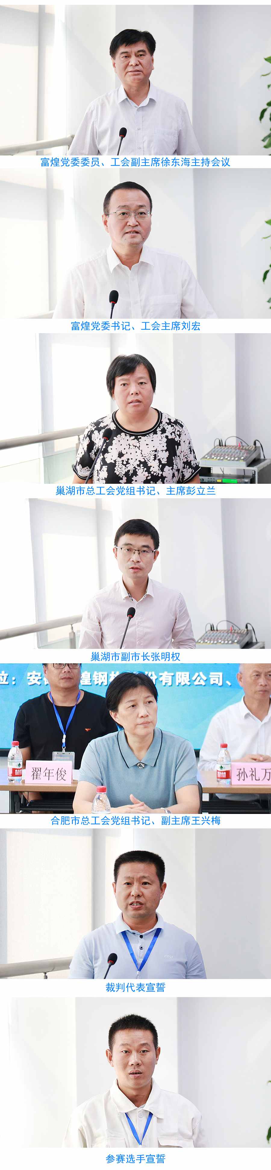 有关领导,裁判员,各代表队领队、选手近百人出席了竞赛开幕式。开幕式上,合肥市总工会党组书记、副主席王兴梅,巢湖市副市长张明权,巢湖市总工会党组书记、主席彭立兰,富煌党委书记、工会主席刘宏分别为本次竞赛开幕式致辞。裁判员、选手代表在开幕式上分别宣誓。合肥市总工会党组成员、副主席葛甫瑜,合肥市总工会劳动和经济工作部部长崔莉,巢湖市黄麓镇党委副书记、工会联合会主席翟年俊应邀出席本次竞赛开幕式。开幕式由富煌党委委员、工会副主席徐东海主持。
