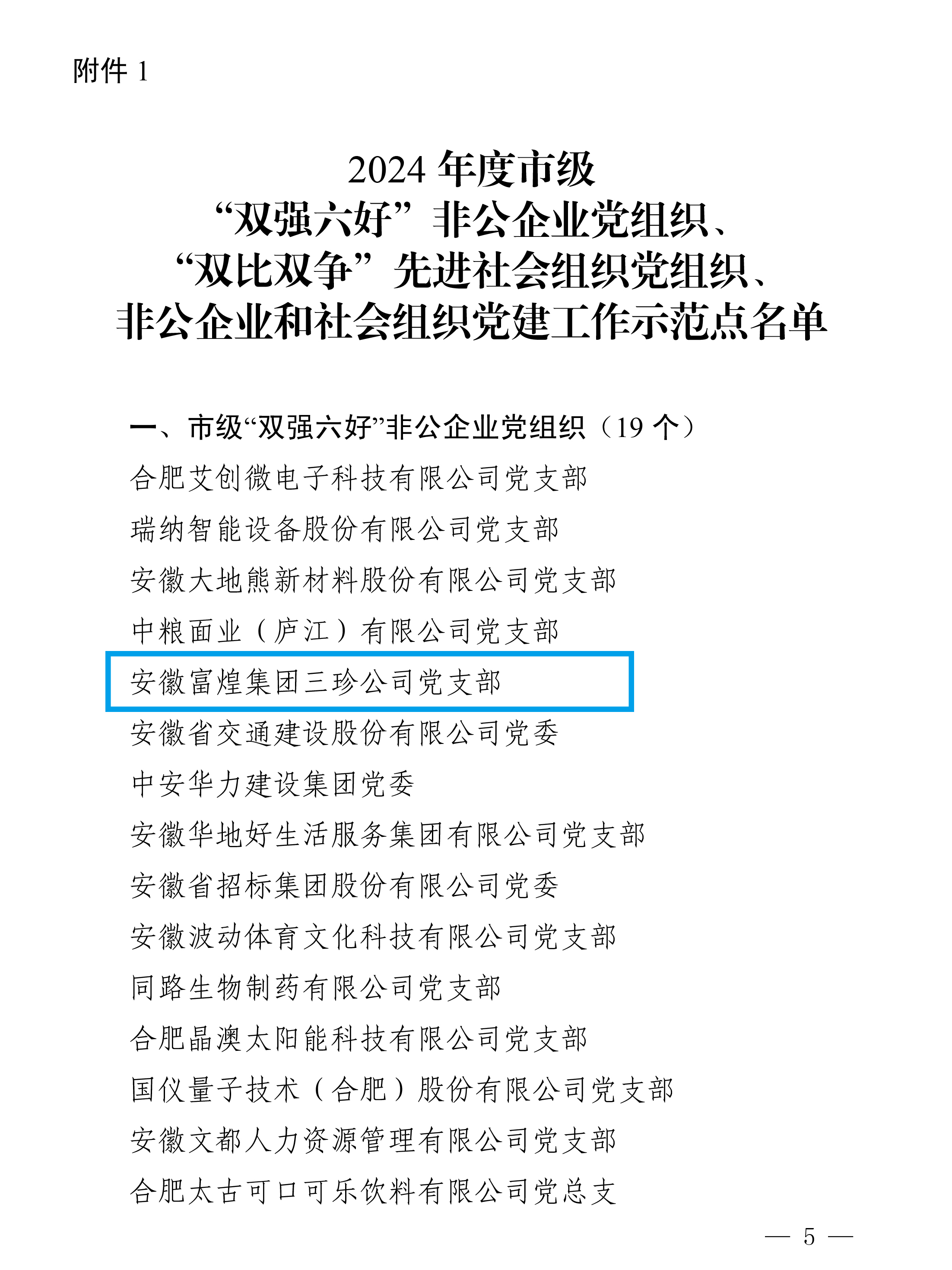 近日,中共合肥市委组织部、中共合肥市委社会工作部、中共合肥市委非公经济和社会组织工委印发《关于命名2024年度市级“双强六好”非公企业党组织、“双比双争”先进社会组织党组织、非公企业和社会组织党建工作示范点的通知》,安徽富煌集团三珍公司党支部凭借扎实的党建工作成效与高质量发展的卓越实践,从全市众多优秀非公企业中脱颖而出,成功荣获“双强六好”非公企业党组织称号。在此次入选的19家企业党组织中,三珍党支部是合肥市农业产业化及水产食品领域唯一上榜的单位,这标志着企业党建与生产经营深度融合的实践成果得到了高度认可。