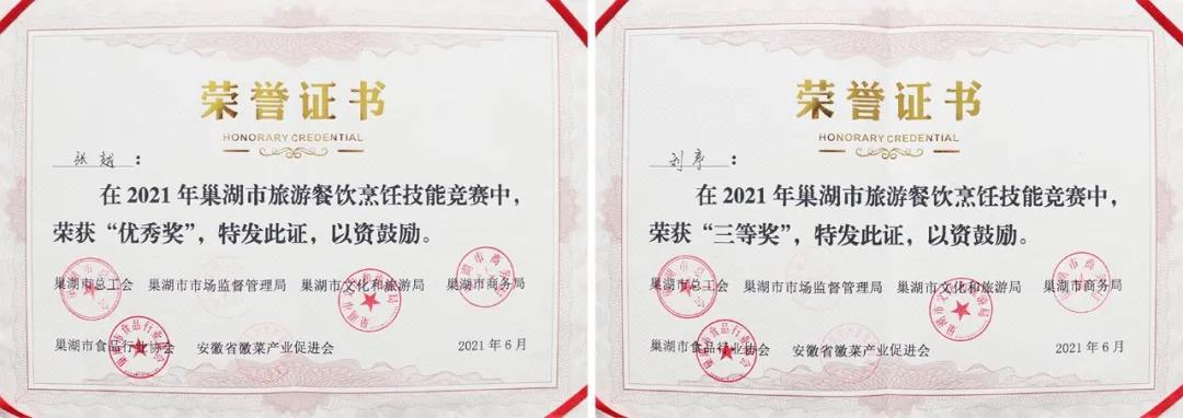 巢湖半岛酒店喜获“2021年巢湖市旅游餐饮烹饪技能竞赛”两项荣誉
