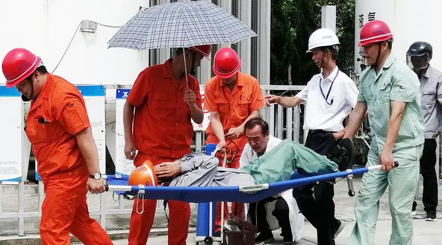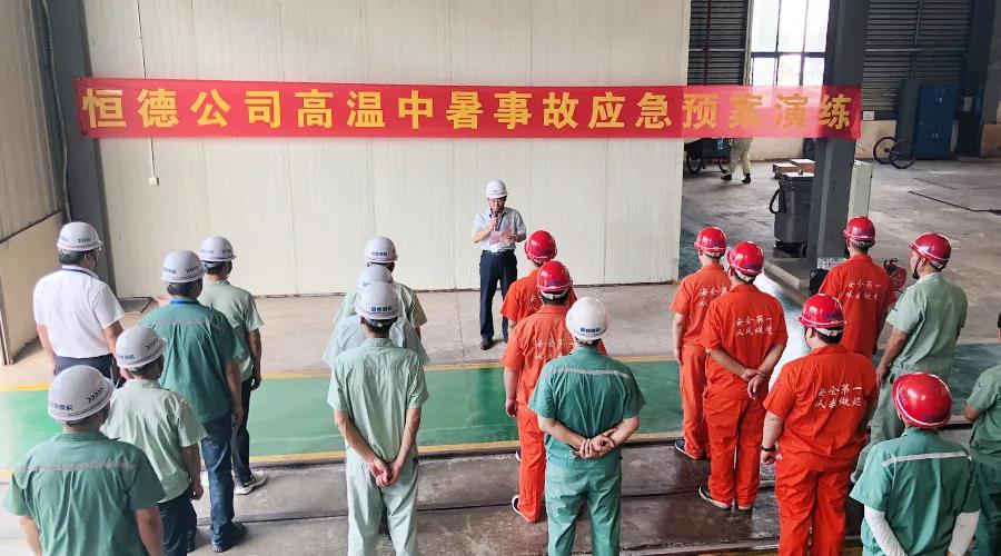 “高温中暑事故应急救援预案演练活动”由恒德公司安环办主管叶圣祥主持。三分厂一名员工在从事气体保护焊作业时,因天气炎热,不幸中暑倒地,现场班组长立即通知分厂厂长,分厂厂长接到事故报告后,立即启动应急救援预案,各参演小组迅速行动,医疗救护组按照“移”、“降温”、“补水”、“促醒”、“转送”等急救步骤有条不紊地进行施救……