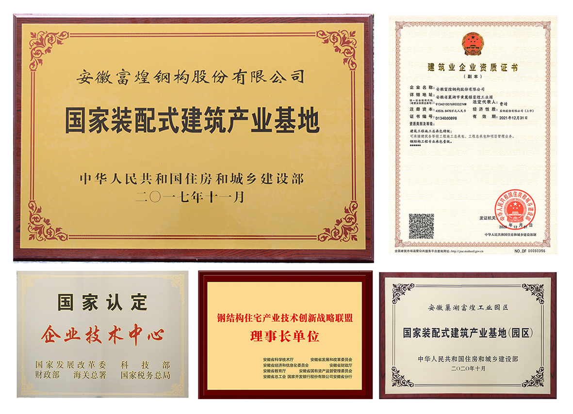 作为安徽进军建筑产业化的先锋企业,富煌钢构早在2008年就被认定为“国家高新技术企业”;2014年获批“国家认定企业技术中心”;2016年取得“安徽省建筑产业现代化示范基地”称号;2017年3月荣获“建筑工程施工总承包特级”资质;2017年11月被住建部评为首批“国家装配式建筑产业基地”;2018年当选“国家装配式钢结构建筑技术创新联盟”理事长单位;2020年入选“安徽省首批省级装配式建筑产业基地”称号、牵头编制的《合肥市装配式建筑应用技术系列手册》正式发布、所在的富煌工业园被住建部认定为“国家装配式建筑产业基地(园区)”。