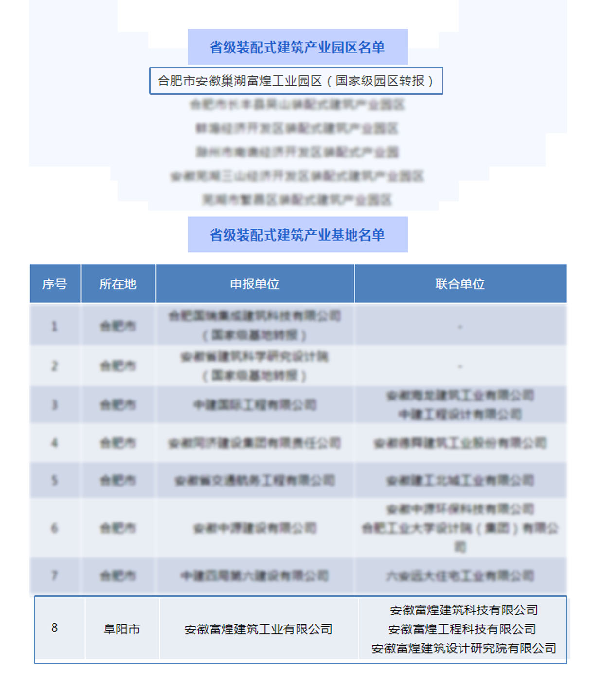 9月10日,安徽省住房和城乡建设厅公布了省级装配式建筑示范城市、产业园区及产业基地的名单,安徽富煌钢构股份有限公司所在的富煌工业园成功入选省级装配式建筑产业园区名单,旗下的安徽富煌建筑科技有限公司、安徽富煌工程科技有限公司、安徽富煌建筑设计研究有限公司成功入选省级装配式建筑产业基地名单,此次全省仅有6个园区、21家单位被安徽省住建厅授予省级装配式建筑产业园区和省级装配式建筑产业基地称号。