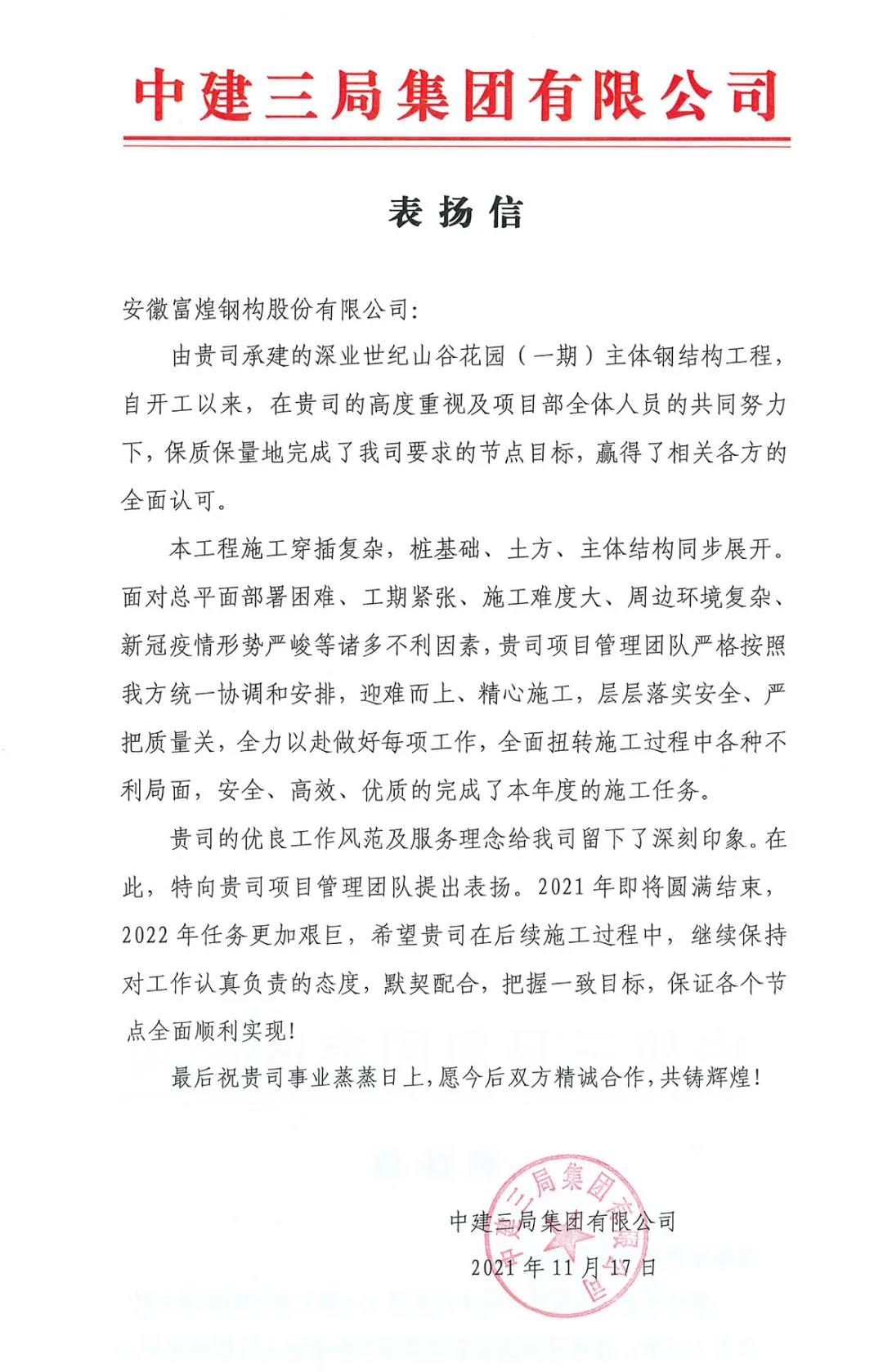 信中对富煌钢构承建的深业世纪山谷花园(一期)项目和安徽加味可生物科技有限公司1#丙类生产车间项目在施工期间,周密安排,科学的制定施工进度和资源投入计划,安全、高效、保质保量的完成规定施工节点所做出的努力表示由衷的感谢。