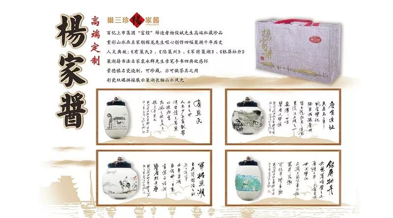 “巢三珍杨家酱”设计及包装独特,“杨家酱”名称取意百亿富煌领航人杨俊斌先生与历史佳话“杨家将”的品质传承,延请巢湖籍山水画名家胡稼龙先生呕心创作了四幅巢湖千年历史人文典故:《有巢氏》、《陷巢州》、《军将巢湖》、《银屏牡丹》,延请巢湖籍书法名家袁永群先生为四典故亲笔手书感怀,同时将巢湖姥山岛风光采用彩瓷双碟拼接展示,再由景德镇名瓷工厂将以上设计烧制成罐体,将浓郁的巢湖地域文化与企业文化相融合,受到多人珍藏。