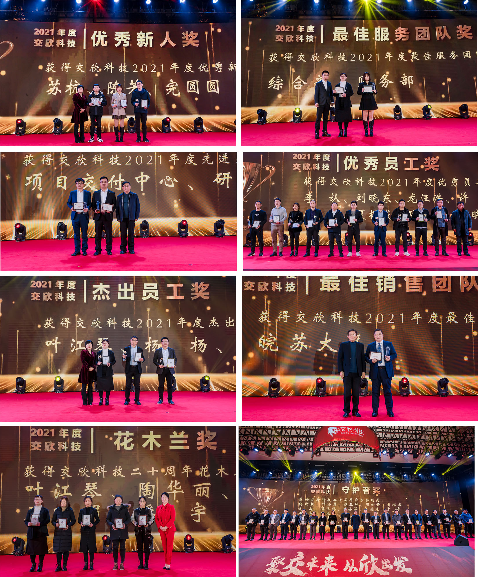 庆典活动上,交欣科技为2021年度先进个人、先进集体分别颁发了,优秀员工奖、杰出员工奖、最佳销售团队奖、先进集体奖、花木兰奖、守护者奖等奖项,以褒奖这些员工在公司发展过程中作出的突出贡献。