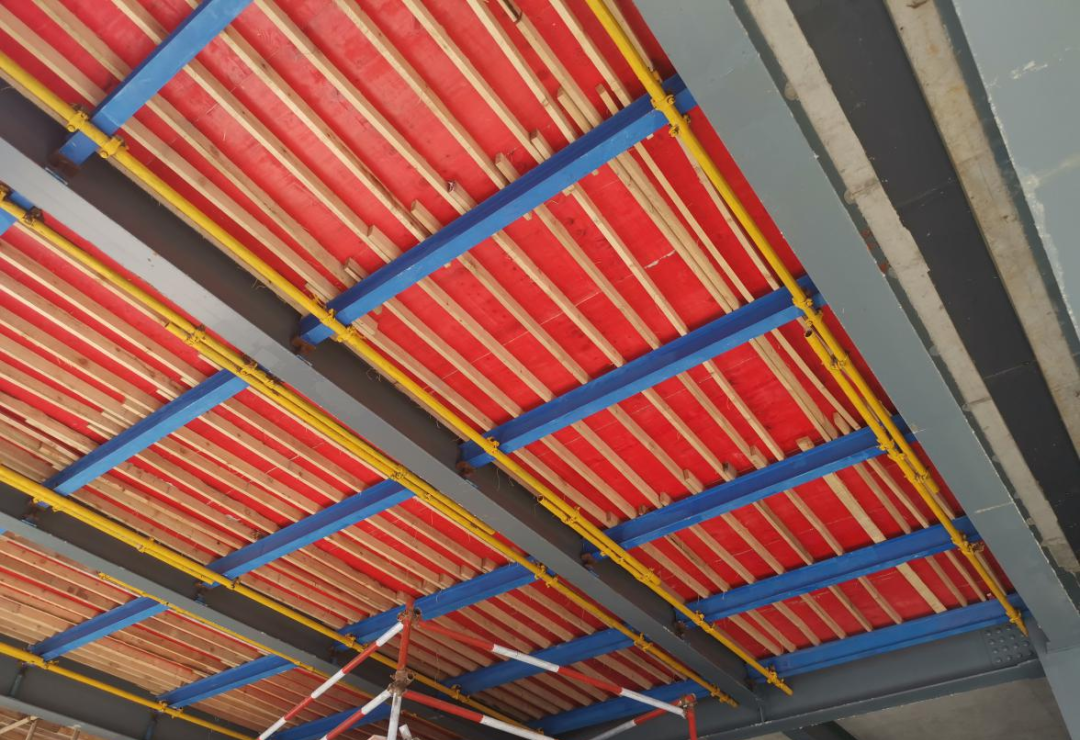 充分利用钢梁(H型钢)的特点,通过在钢梁下翼缘上布置可调支托(包括含承靴底座、可调托撑和螺母),上安放方钢管(主龙骨),通过螺杆实现可调节支撑的高度调节,进而实现整个支撑结构水平面内的整体可调。项目取得安徽省工法一项。