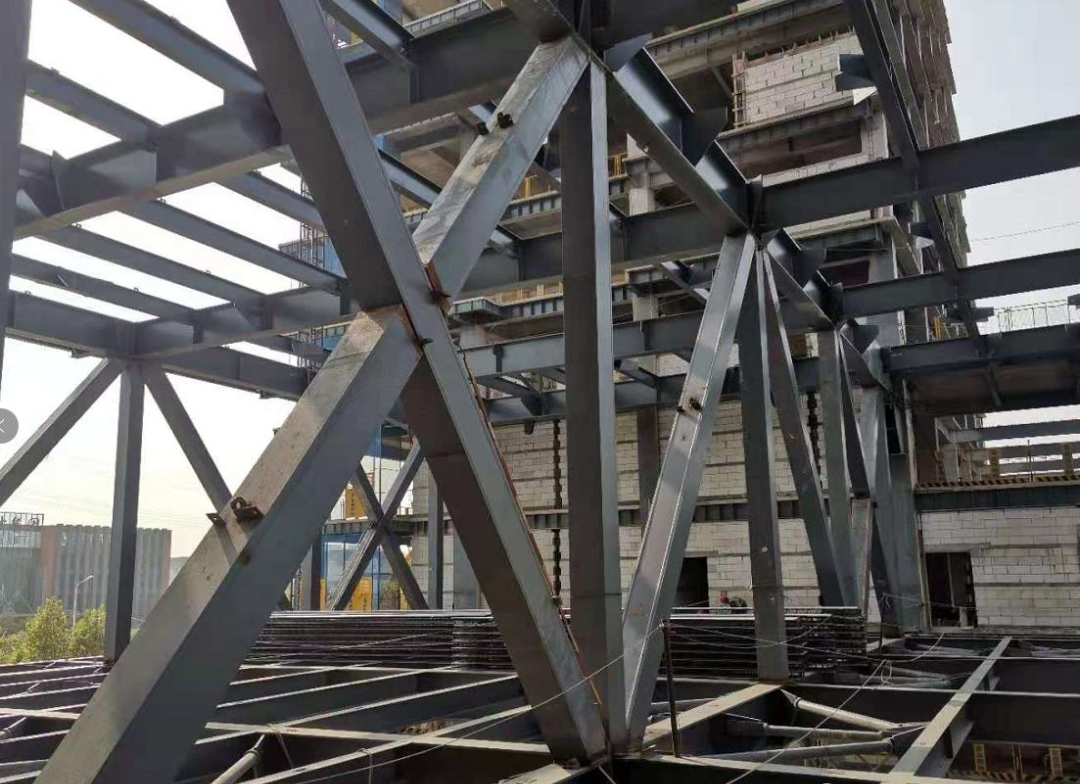预制构件主要包括预制钢梁、钢柱、钢桁架、桁架钢筋楼承板等。项目地下部分为型钢混凝土组合结构,地上部分为装配式钢结构,其中A塔楼为钢框架-中心支撑结构,结构抗震等级为三级,其中钢柱为二级;B塔楼为钢框架结构,结构抗震等级为三级,其中钢柱为二级;裙楼为钢框架结构,抗震等级为三级。A、B塔楼均采用矩形钢管混凝土柱,裙房采用矩形钢管柱,钢梁均为焊接H型钢。连廊部分为钢桁架结构,其中柱、斜腹杆为矩形钢管,主梁为焊接H型钢,楼板采用钢筋桁架楼承板。连廊为整体桁架式无柱跨层大空间,空间尺度达到30mx28mx9.6m(H),为工厂分段预制,工业化程度极高。