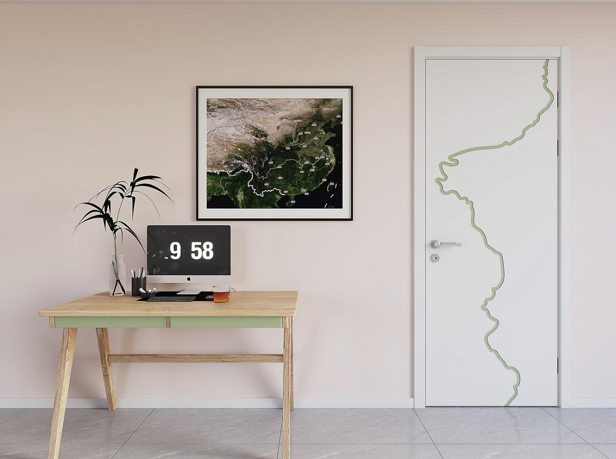 该作品设计灵感来源于长江——长江发源于青藏高原,滋养着中华儿女,如同一扇门守卫着一个家庭。王德浩把长江的文化内涵融入到木门的极简风格中,用基础型的平板铣型门做套色设计,将长江主流线形状,放入白色雾面哑光的平板门中,蜿蜒跃动着,墨绿色流动的线条与白色的笔直正形成对比,采用墨绿色也契合了当下青山绿水就是金山银山的环保理念。