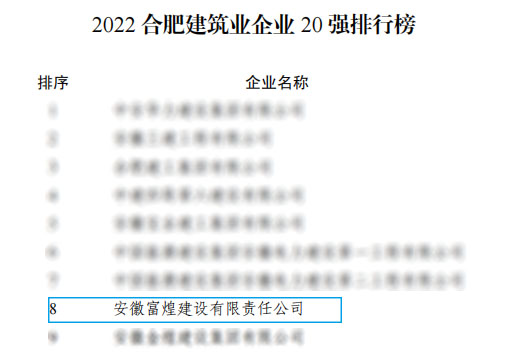 近日,合肥市企业(企业家)联合会正式发布2022合肥企业50强、合肥制造业企业30强、合肥服务业企业20强、合肥建筑业企业20强、合肥农业企业20强榜单。安徽富煌建设有限责任公司成功入选2022合肥企业50强和合肥建筑业企业20强,安徽富煌三珍食品集团有限公司入选合肥农业企业20强。