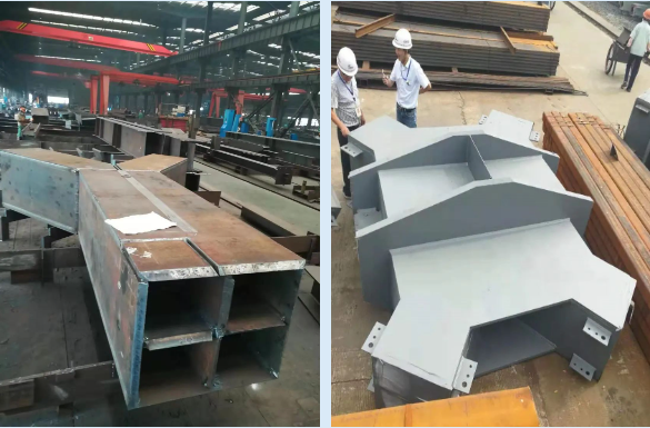 4、设计开展了箱型钢管新型斜交节点内部混凝土浇灌足尺模型试验,研发了高层钢结构田字柱和薄壁箱型柱制作方法,形成了斜交节点拼装、混凝土浇灌及密实度检测施工工法。