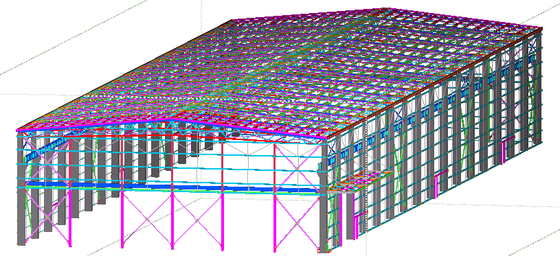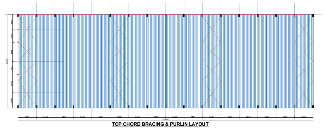 该项目为桁架式轻钢屋面厂房结构,总长104米,宽33.2米,檐口高度12米,主体采用平面矩形管桁架结构,并在桁架上下弦设置屋面支撑。项目涵盖钢屋架、檩条、抗风柱、吊车梁及雨棚等部分的设计与加工制作,总用钢量约170吨。项目设计充分考虑当地使用需求,纵向布置两台10吨吊车,西侧山墙面另设5吨吊车,结构整体坐落于已完工的混凝土柱上,兼顾实用性与安全性。