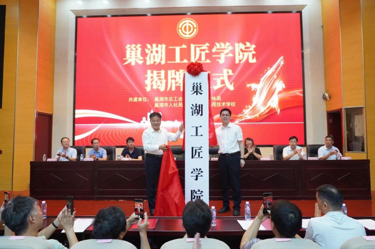 近日,巢湖工匠学院在合肥市工程技术学校揭牌成立,标志着巢湖市人才培养工作迈上新台阶,产业工人队伍建设改革工作迈上新征程。合肥市总工会党组成员、副主席郭玉玺,巢湖市政府副市长苗宁宁,合肥市工程技术学校党委书记王成满、富煌集团党委副书记兼工会副主席徐东海等领导出席揭牌仪式,活动由巢湖市总工会党组书记、主席彭立兰主持。