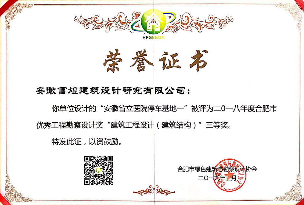二〇一八年度合肥市优秀工程勘察设计奖建筑工程设计(建筑结构)三等奖”